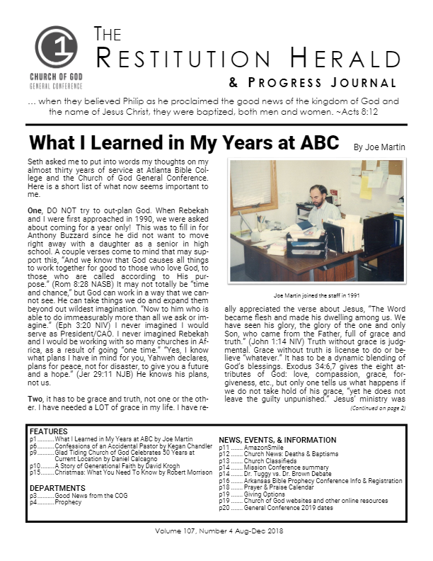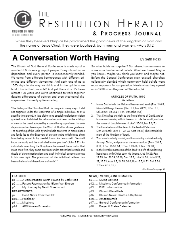 Features p1 - A Conversation Worth Having p5 - Future Fascination p6 - My Journey p10 - Prophecy Page p14 - Atlanta Bible College: [...]